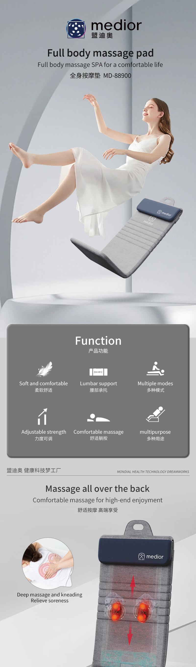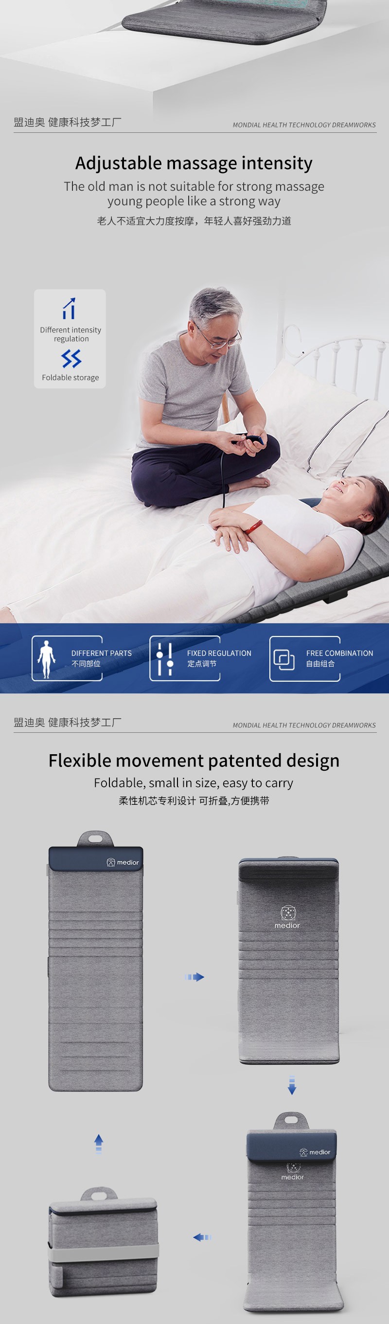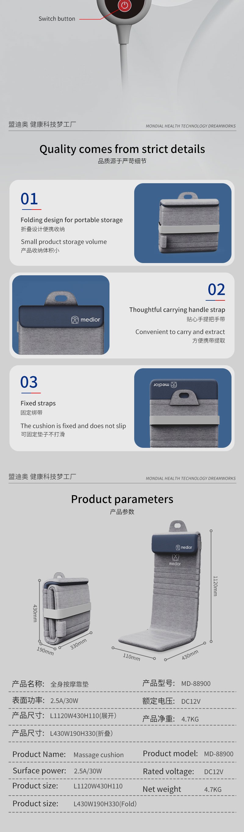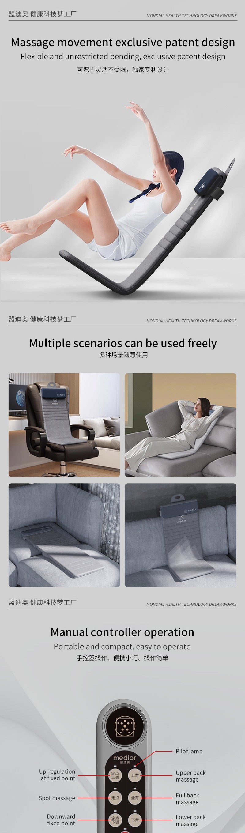 1、L型機(jī)芯結(jié)構(gòu),對折包裝縮小體積2、獨家專利柔性機(jī)芯3、力度三檔調(diào)節(jié),定點按摩,腰背按摩、臀腿按摩、全背按摩模式選擇4、背部行走揉捏,按摩區(qū)域加長到從肩膀到大腿;5、更加貼合不同款式的椅子整體可對折收納