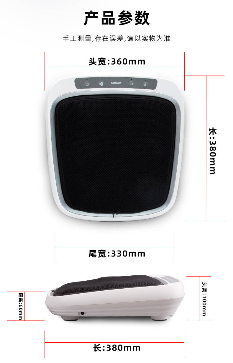功能特征:腳底六個按摩頭,三檔力度調(diào)節(jié),按摩頭正反轉(zhuǎn)/紅綠燈轉(zhuǎn)換,按摩頭加熱,冷風(fēng)降溫,15分鐘定時,可拆洗腳套,按鍵控制面板